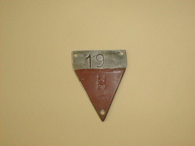 Spits toelopend aluminium plaatje met gaatjes in drie hoekpunten. De driehoek in het spitse gedeelte is rood geschilderd; erin is de letter H zichtbaar. Boven het rode gedeelte het nummer 19. Mogelijk afkomstig uit een concentratiekamp.