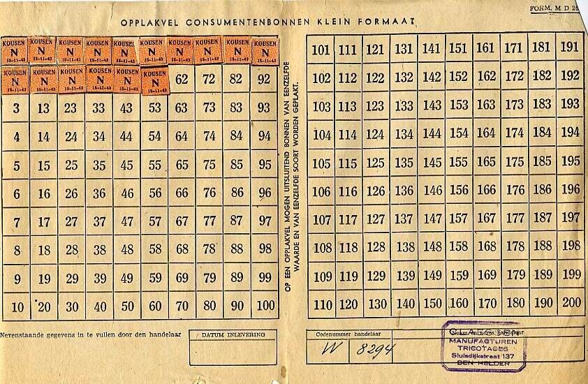 Zeven opplakvellen consumentenbonnen klein formaat. De vellen zijn verdeeld in 200 genummerde vakken waarop een klein aantal distributiebonnen voor kousen is geplakt. Op de vellen een stempel van de firma "Claessen, manufacturen, tricotages" te Den Helder.