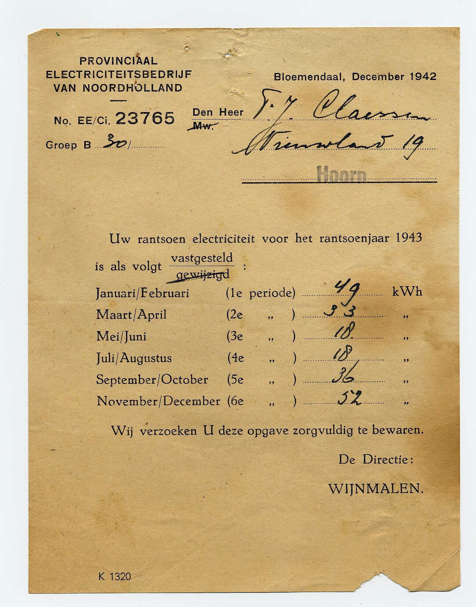 Twee overzichten, gericht aan de heer F.J. Claessen te Hoorn, met daarin de aan hem toegekende electriciteitsrantsoenen voor de jaren 1943 en 1944.