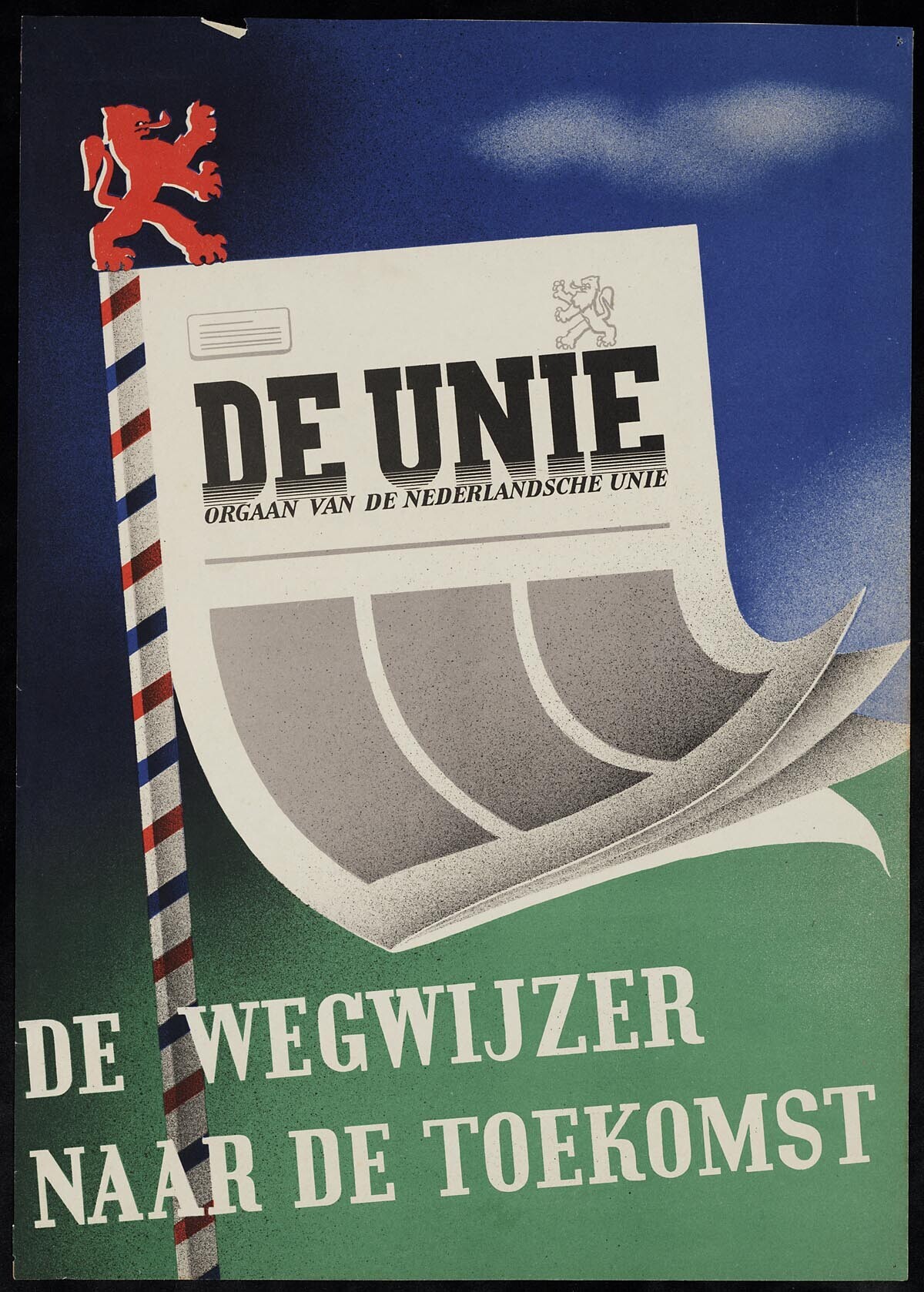 Pamflet van de Nederlandsche Unie met de leus ''De wegwijzer naar de toekomst''.