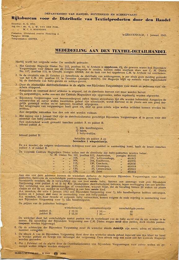 Zeven documenten gerelateerd aan de textielfirma Claessen in Den Helder. De documenten betreffen o.a. mededelingen van het ''Rijksbureau voor de Distributie van Textielproducten door den Handel'', een briefkaart over de levering van textiel en een briefkaart aan de firma Claessen met daarop de mededeling dat door verschillende omstandigheden nog niet tot de aflevering van babypakketten kon worden overgegaan.