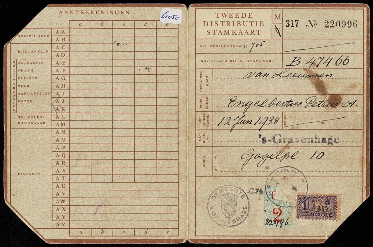 Een "Tweede Distributie Stamkaart" met het nummer 220996 op naam van Engelbertus Petrus A. van Leeuwen met geboortedatum 12 juni 1938, wonende op het Gagelplein 10 te Den Haag. De kaart draagt een stempel van de gemeente Den Haag.
