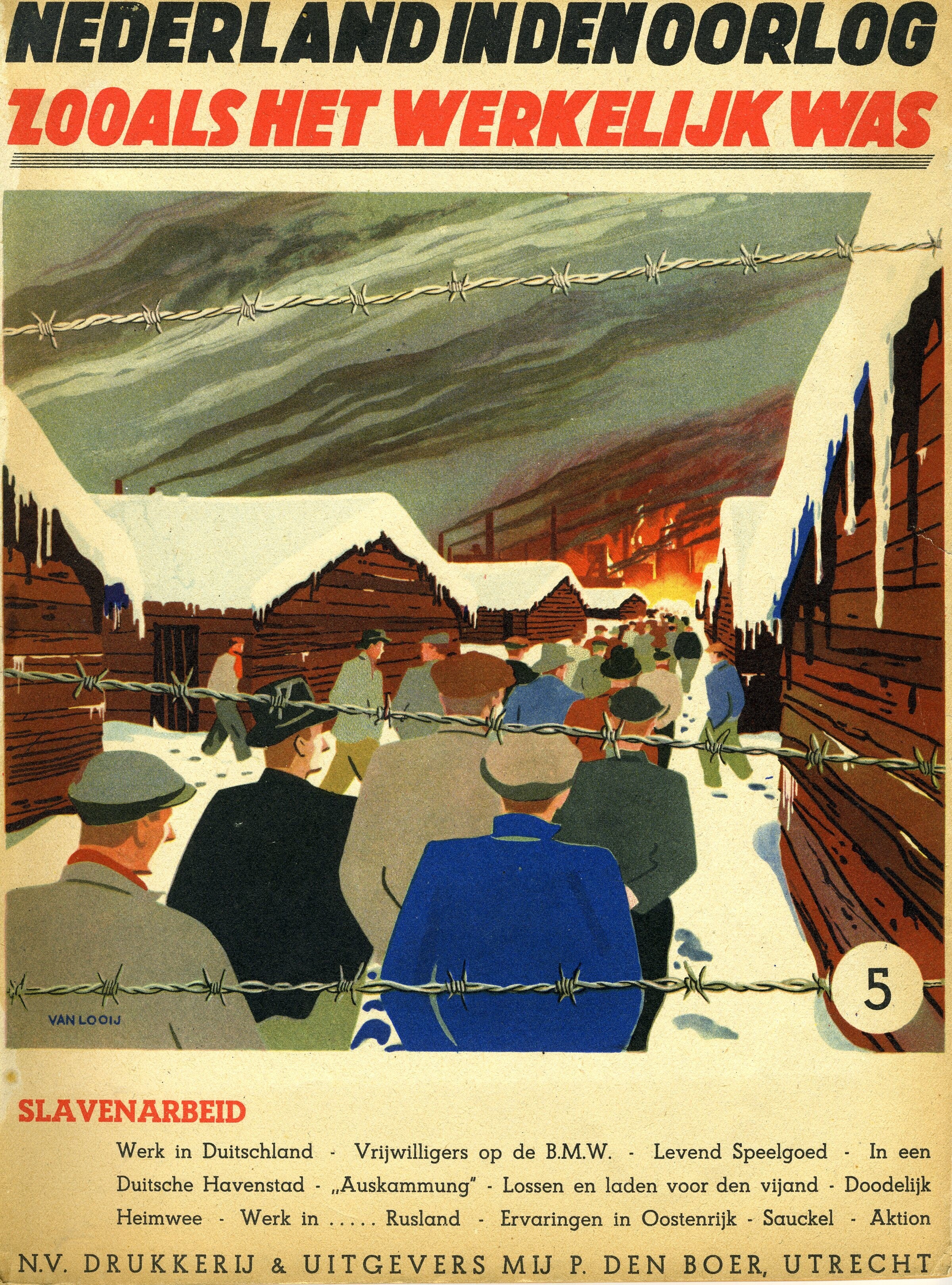 Drie exemplaren van het vijfde deel van ''Nederland in den Oorlog. Zooals het werkelijk was'',. Het betreft een zesdelige reeks boeken over de geschiedenis van de Tweede Wereldoorlog. De boeken hebben een slappe kaft en zijn geïllustreerd met zwartwit foto's. Ieder deel behandeld een apart onderwerp. Deel 5 is getiteld: ''Slavenarbeid.'' Aan de orde komt o.a. de arbeidsinzet.