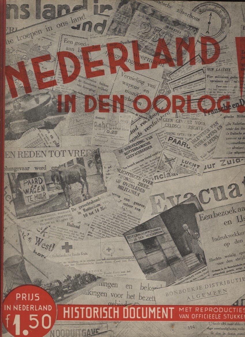 Het eerste deel van de uitgave "Nederland in den Oorlog! Historisch document met reproducties van officieele stukken". Het geeft een overzicht van de oorlog aan de hand van artikelen uit de Nederlandse kranten en kopieën van originele documenten in mei 1940. Met ex libris: F.A. Maronier jr.