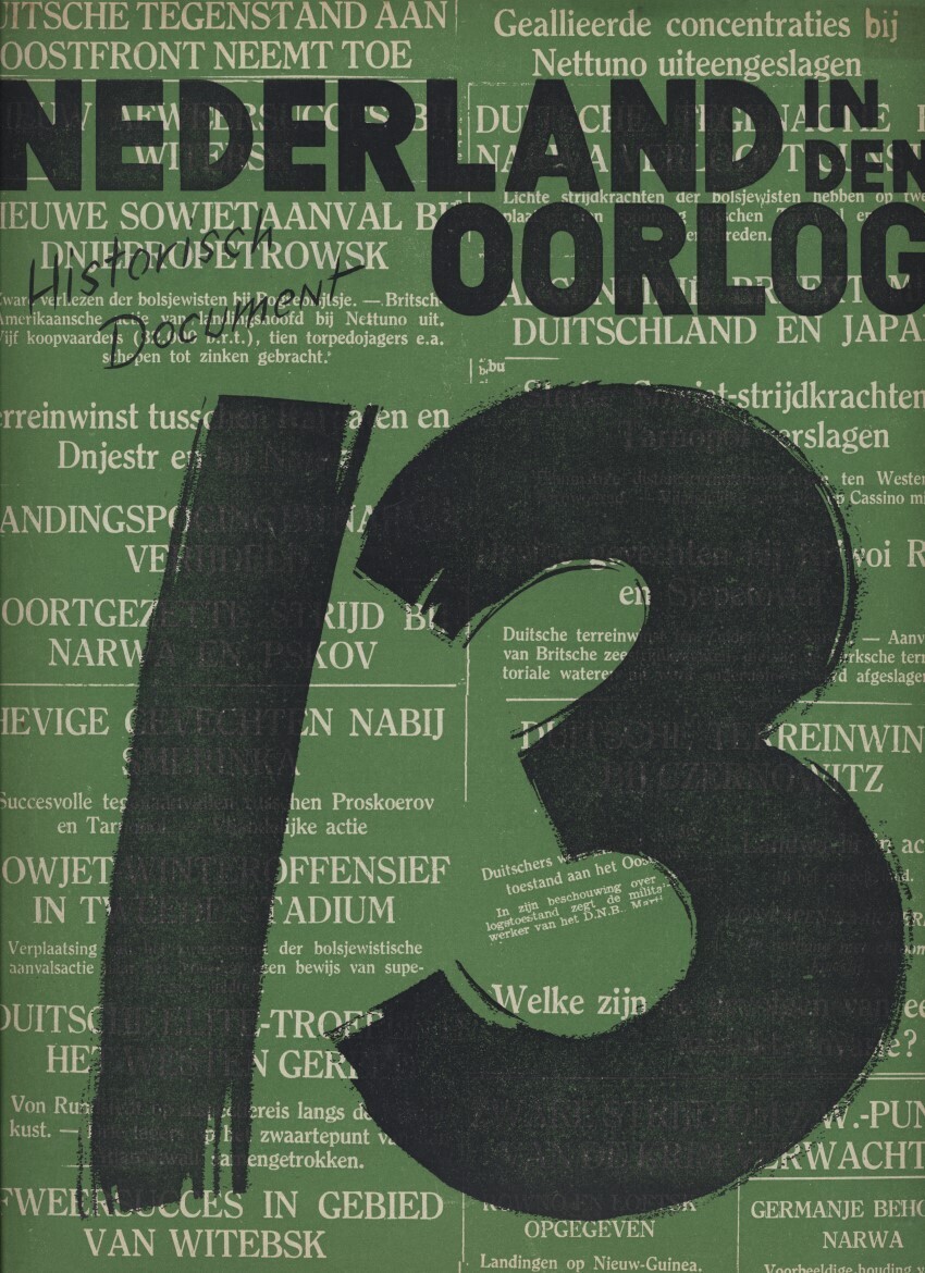Het dertiende deel van de uitgave "Nederland in den Oorlog! Historisch document met reproducties van officieele stukken". Het geeft een overzicht van de oorlog aan de hand van artikelen uit de Nederlandse kranten en kopieën van originele documenten van januari tot en met maart 1944.