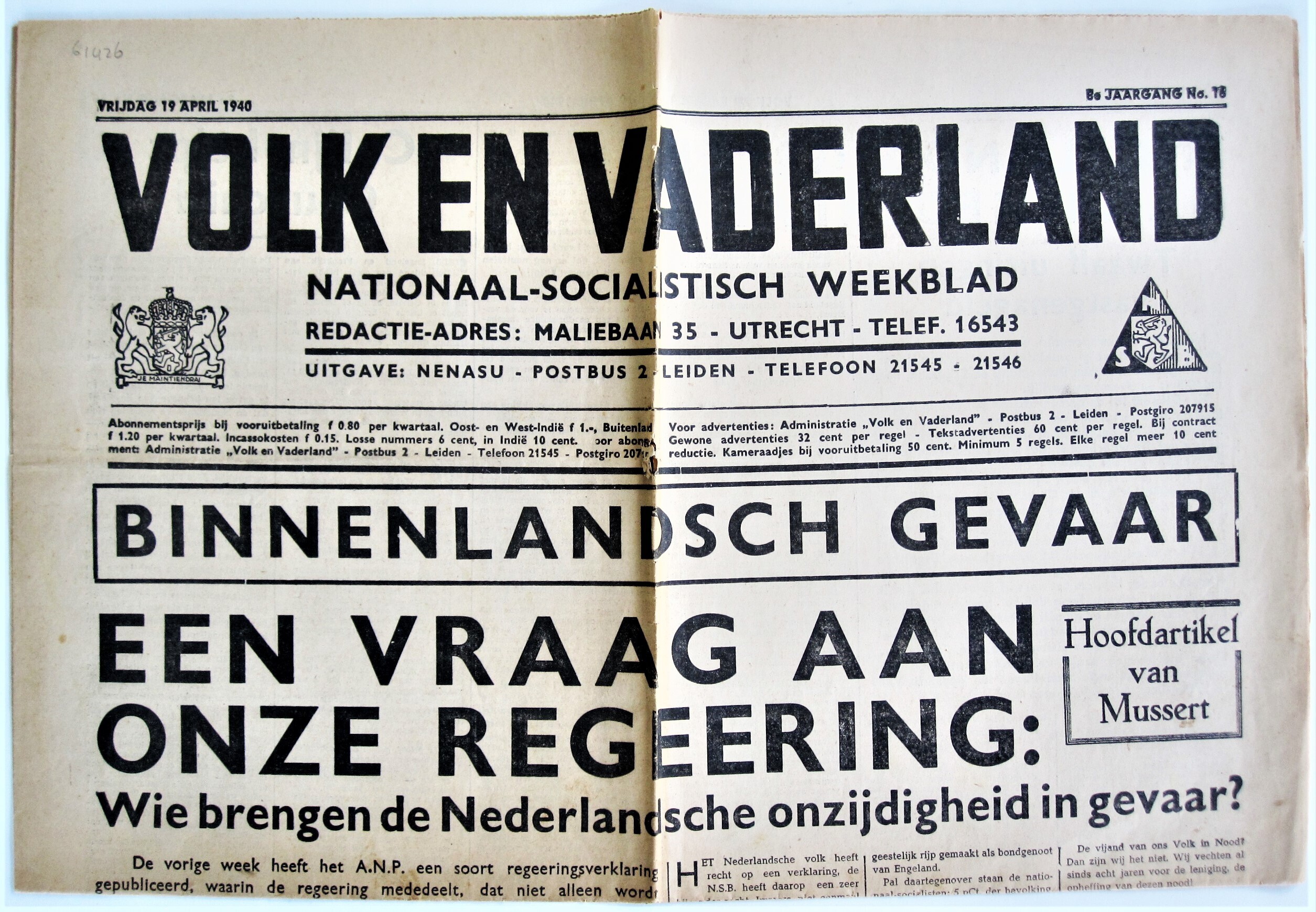Editie van 'Volk en Vaderland', nationaalsocialistisch weekblad van de N.S.B. Het betreft nummer: 16 van jaargang 8 (19 april 1940).