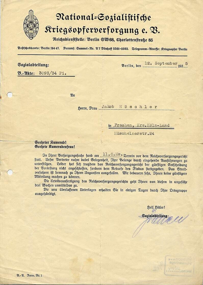 Voorgedrukte en met schrijfmachine verder ingevulde brief waarin Jakob Höschler wordt medegedeeld dat zijn zaak door het "Reichsversorgungsgericht" is afgewezen. De brief eindigt met: "Heil Hitler".