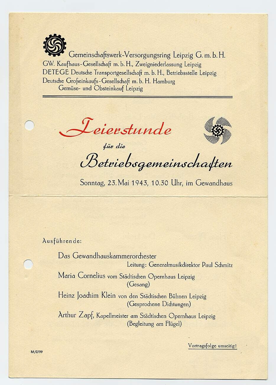Programma's van muziekuitvoeringen, georganiseerd door het "Gemeinschaftswerk-Versorgungsring Leipzig G.m.b.H." op 3 mei 1942 (twee exemplaren) en 23 mei 1943.