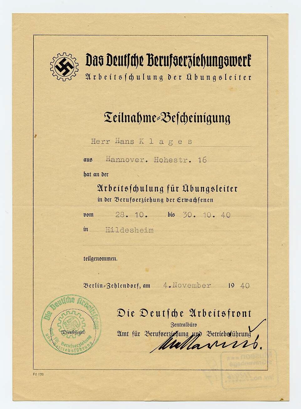 Getuigschrift uitgereikt aan Hans Klagers, omdat hij van 28 tot en met 30 oktober 1940 in Hildesheim heeft deelgenomen aan de "Arbeitsschulung füÂr Ubungsleiter in der Berufserziehung der Erwachsenen".