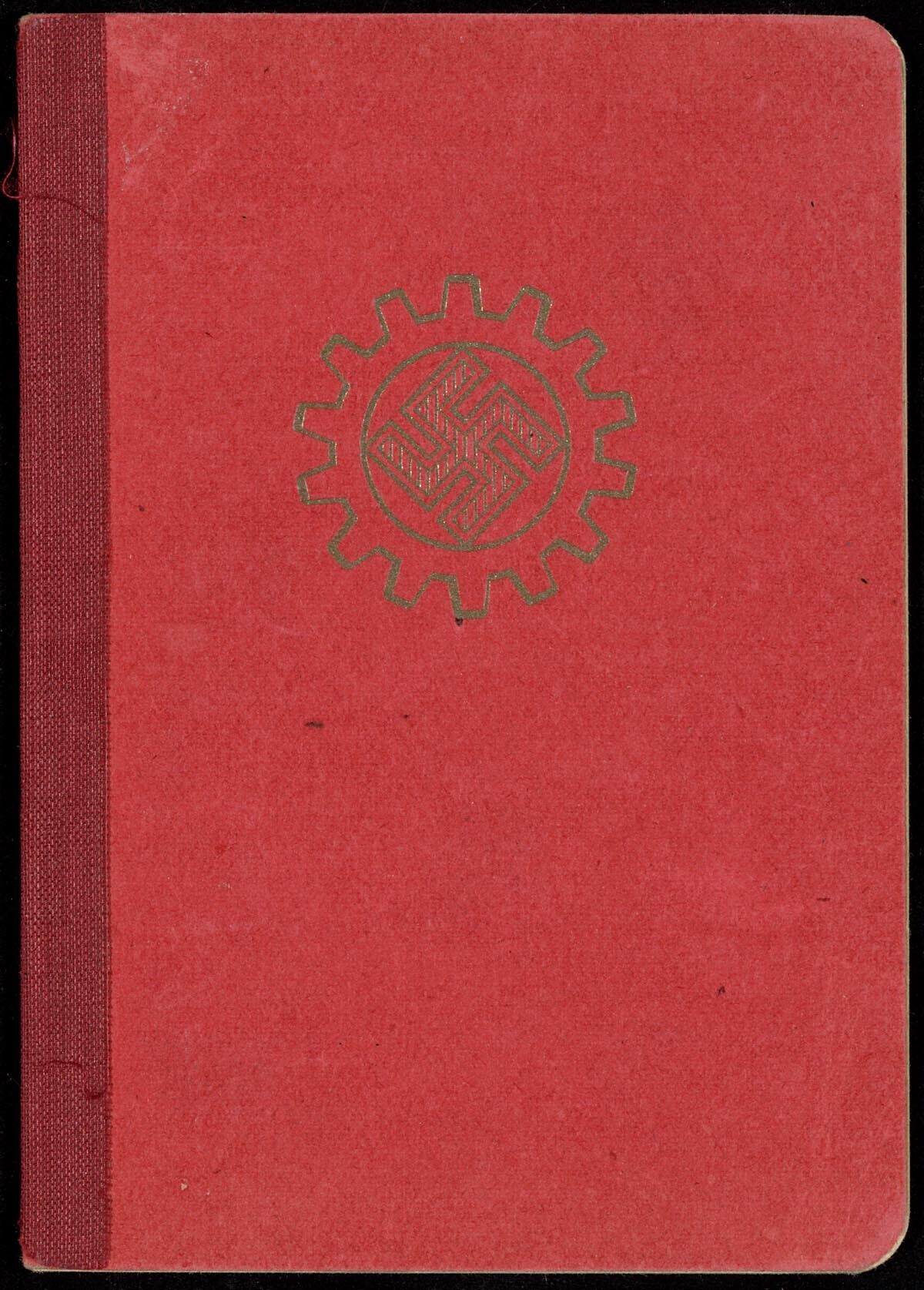 Lidmaatschapsboekje afgegeven op 1 februari 1935 te NeumüÂnster, op naam van Kate Schudareck. Omslag rood met daarop de afbeelding van een tandwiel met een hakenkruis erin. Daarbij een blauwe verklaring van het Deutsche Arbeitsfront op naam van Jozef Fitz.