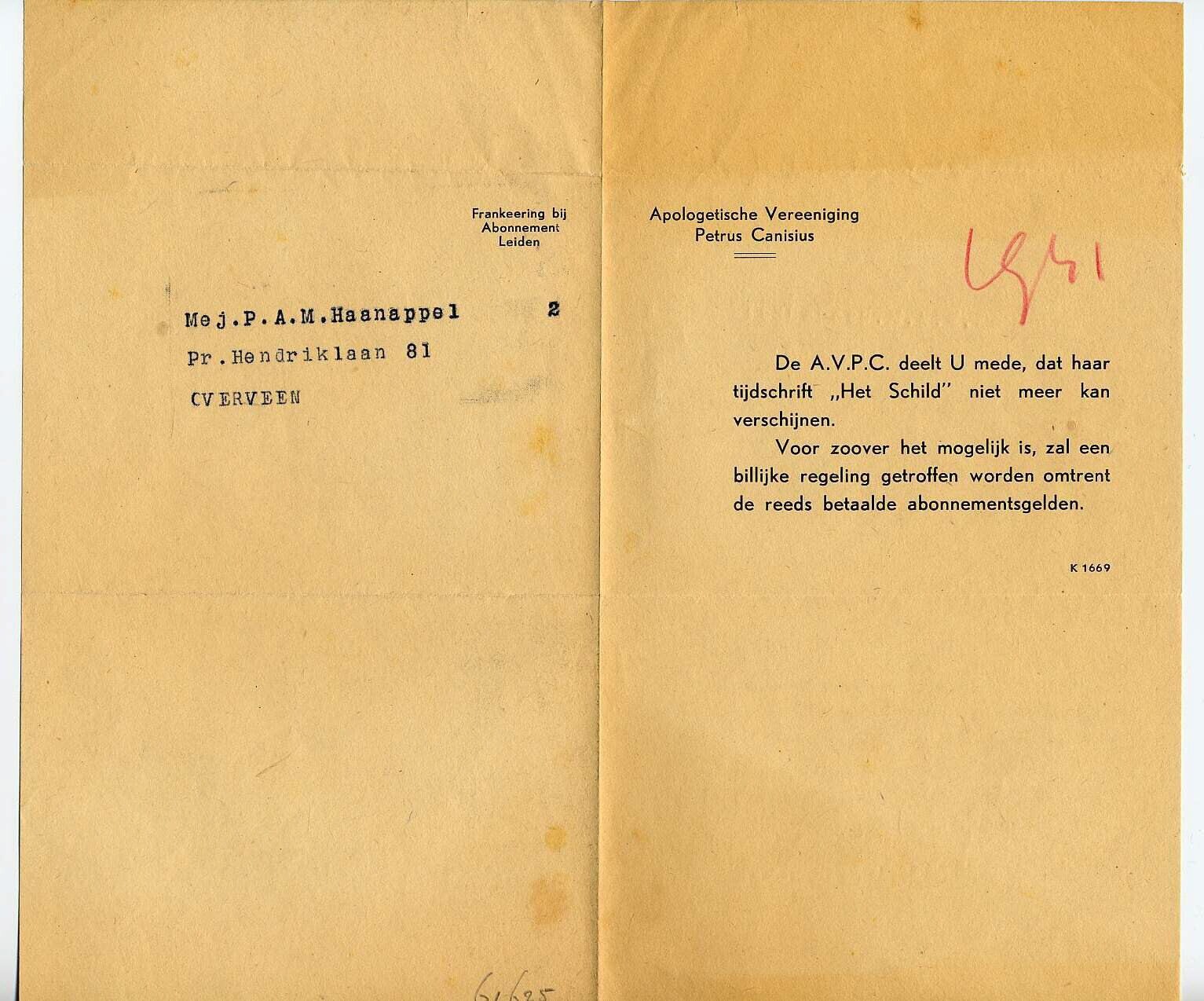 Gedrukte brief van de Apologetische Vereeniging Petrus Canisius, gericht aan Mej. P.A.M. Haanappel in Overveen: "De A.V.P.C. deelt u mede, dat haar tijdschrift "Het Schild" niet meer kan verschijnen. Voor zoover het mogelijk is, zal een billijke regeling getroffen worden omtrent de reeds betaalde abonnementsgelden."