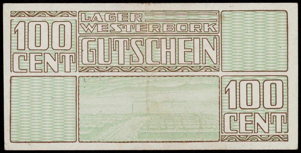 In groen, bruin en wit uitgevoerd biljet met op de ene kant de tekst "Lager Westerbork Gutschein" met een kampgezicht en tweemaal de vermelding "100 cent". Op andere kant een skyline van een stad met rokende schoorsteen en een tandwiel eromheen. Daaronder de tekst: "dieser Gutschein ist nur innerhalb des Lagers güÂltig", "Lager Westerbork 15 februari 1944" en de ondertekening door de kampcommandant.