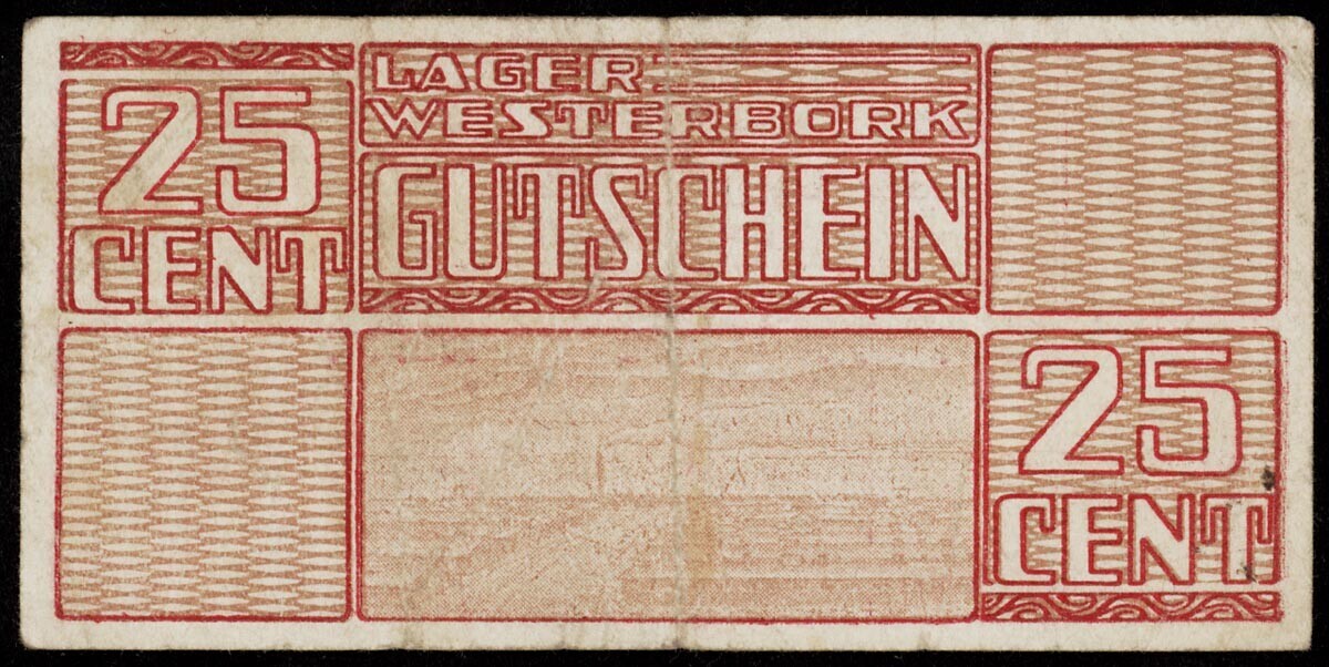 In rood enbruin uitgevoerd biljet met op de ene kant de tekst "Lager Westerbork Gutschein" een kampgezicht en tweemaal de vermelding "25 cent". Op andere kant de skyline van een stad met rokende schoorsteen en een tandwiel eromheen. Daaronder de tekst: "dieser Gutschein ist nur innerhalb des Lagers güÂltig", "Lager Westerbork 15 Februar 1944" en de ondertekening door de kampcommandant.