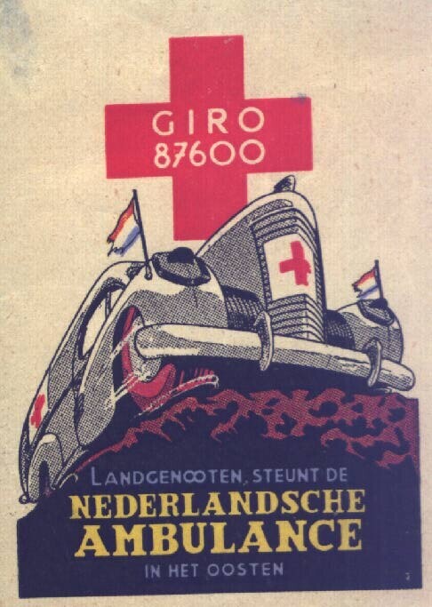 Vier zegels met daarop de afbeelding van een ambulance met wapperende Nederlandse vlaggen. Boven het voertuig een rood kruis met het gironummer 87600. Onderaan de tekst; "Landgenooten steunt de Nederlandsche ambulance in het oosten".