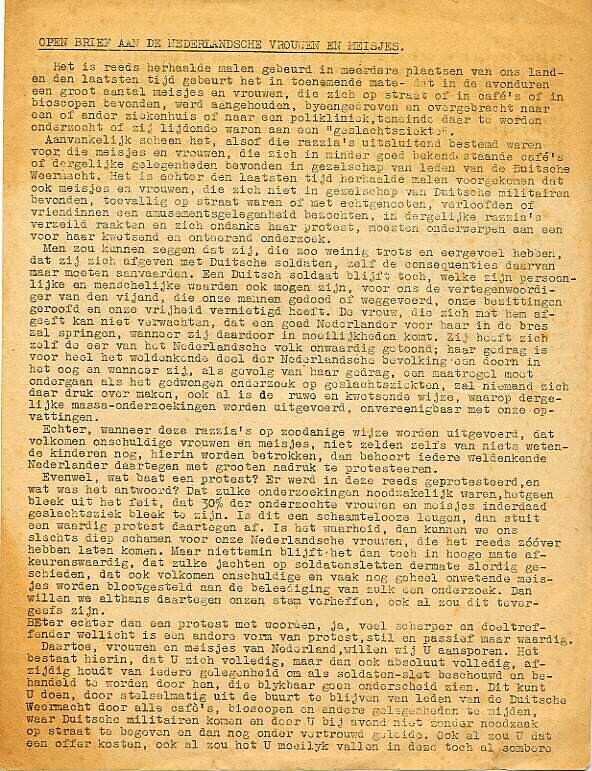 Gestencild document met een protest tegen razzia's op vrouwen die vervolgens op een "kwetsende en onteerende" manier op geslachtsziekten worden onderzocht. Onderaan een oproep om het document te vermenigvuldigen en verder te verspreiden.