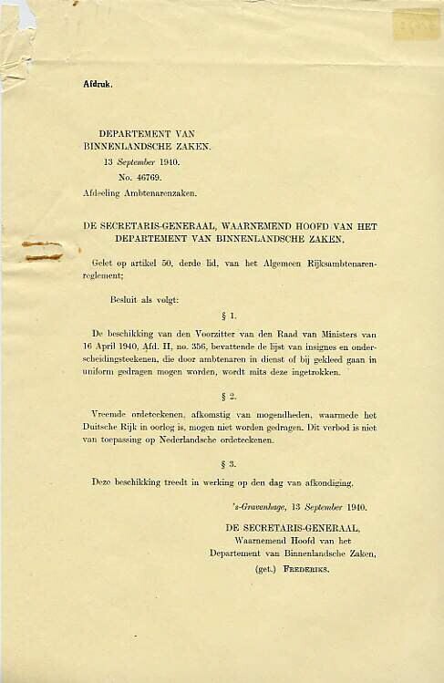 Drie brieven over het dragen van onderscheidingstekens van het Departement van Binnanlandsche Zaken, (13 september 1940), van Provinciale Waterstaat van Noord-Holland (23 oktober 1940) en het Provinciaal Bestuur van Noord-Holland (6 augustus 1941).