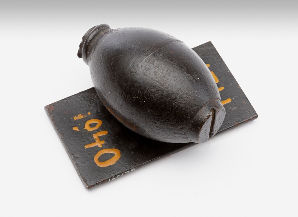 Een ijzeren granaat gemonteerd op een langwerpig metalen plaatje als presse-papier. Op het plaatje: "Mei 1940".