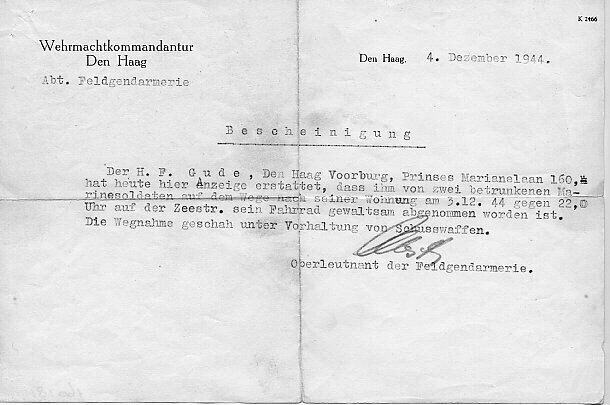 Duitstalige verklaring van de Wehrmachtkommandantur te Den Haag, dat de fiets van H.F. Gude in beslag is genomen door dronken matrozen.