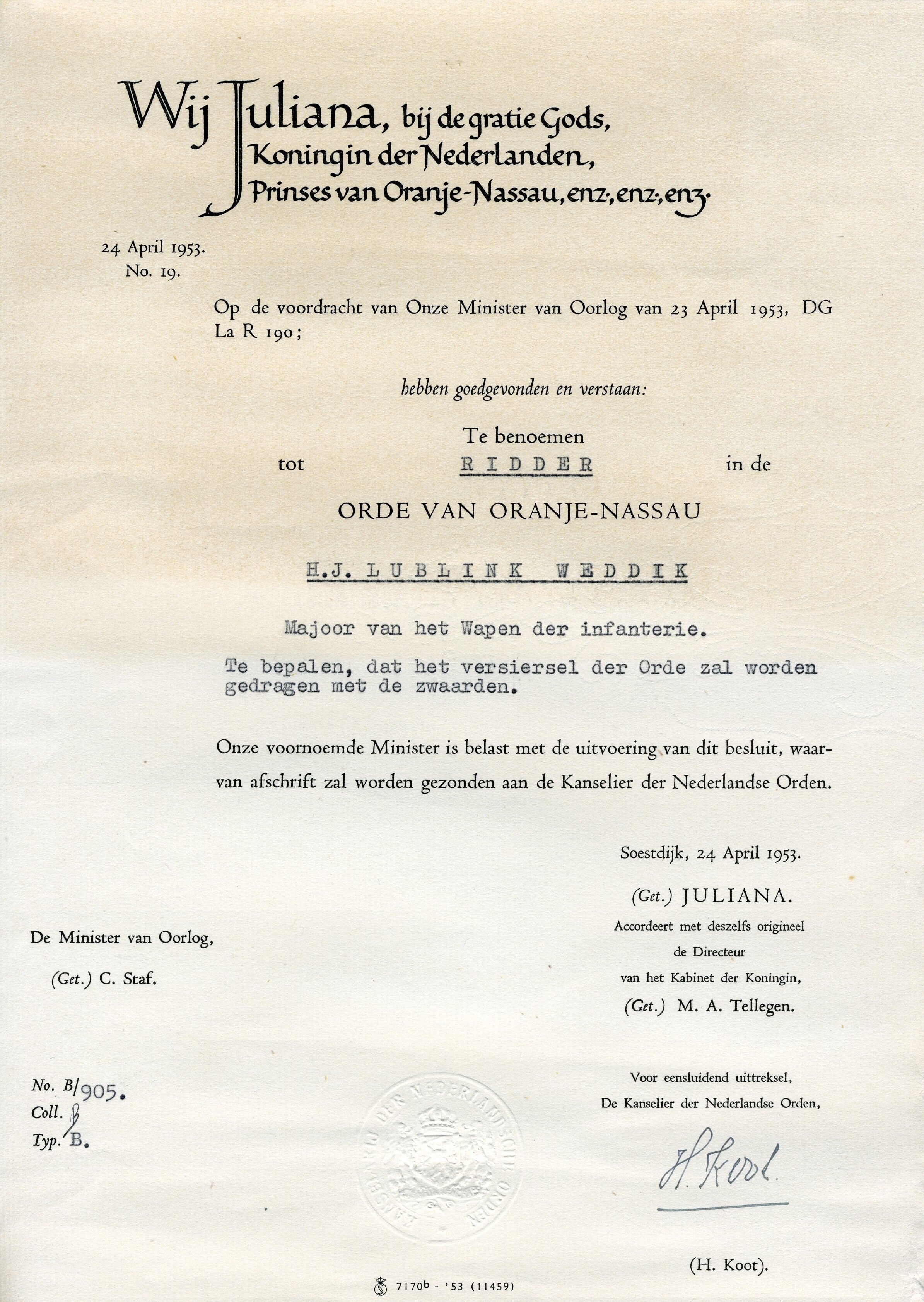 Een kartonnen koker van de Kanselarij der Nederlandse Orden met daarin drie documenten behorende bij de benoeming tot Ridder in de orde van Oranje Nassau van de heer Lublink, majoor van het wapen der infanterie. De koker bevat de Orde van Oranje Nassau. Een oranje wetboekje waarin de wettekst met betrekking tot het verlenen van een onderscheiding. Het derde document betreft de benoeming tot ridder door Koningin Juliana.