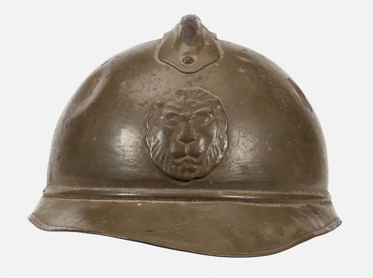 Een groene Franse helm, model Adrian M26 uit de Tweede Wereldoorlog met kam en korte klep en binnenwerk van leer. Op de voorkant een embleem met een leeuwenkop. Links en rechts een beugeltje voor een kinband. De helm is gebruikt door het Belgische leger.