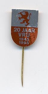 Reversspeld met een U-vormig schildje met bovenaan een oranje Nederlandse leeuw op een zilveren veld en daaronder op een oranje veld in zilver: "20 jaar vrij 1945-1965".