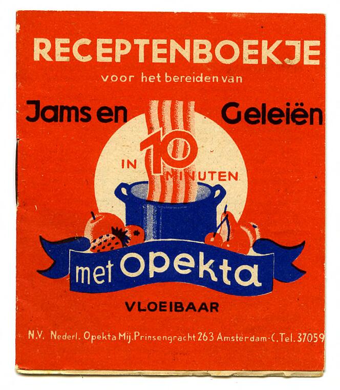 Receptenboekje voor het bereiden van jams en geleiën in 10 minuten met Opekta vloeibaar. Vermelding van het adres Van Slingelandstraat Amsterdam-w.