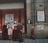 Voornamelijk mensen in klederdracht in de Diezerstraat in de rij voor uitverkoop van textielgoed midden in de oorlog (1942)., 1942