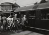 Op bruin papier geplakte afbeelding in zwart-wit van een trein aan het perron van Arnhem Centraal Station. De deur van de internationale trein staat open en mensen stappen in en uit de trein. Uit de trein hangen mensen. Op het perron staat een karretje met bekertjes, flessen en een grote pan erop. Er staat een perronkelner bij met een lange witte jas met split. Boven het perron hangt een perronklok. Onder de klok hangt een bordje met daarop 'Sonsbeekzijde'. Onder de foto is met een blauwe pen het nummer 150 en de titel 'Vertrekkende trein perron Arnhem' evenals de datum 1/8 '59 geschreven. Achterop de foto is een rood stempel aangebracht van E.Z.6 die verder is ingevuld met blauwe pen: 'datum opname: 8-59', 'plaats: Arnhem', 'onderwerp: vertr. Int. trein.', 'opdracht van: E.Z.6' en een rood stempel met 'Foto / Ned. Spoorwegen / Afd. Propaganda / Hessels'.