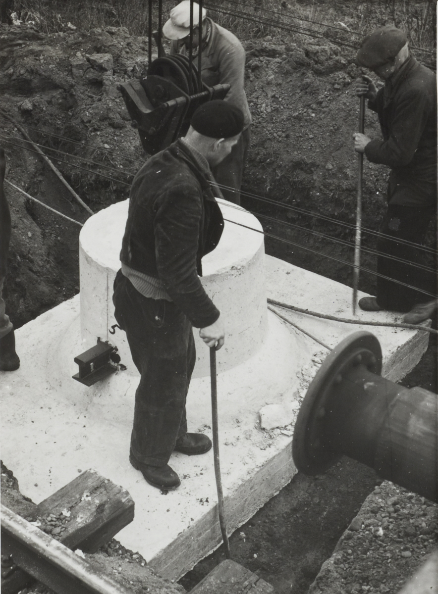Op bruin papier geplakte afbeelding in zwart-wit van werkmannen die een betonnen voet in een gat neerleggen naast het spoor bij Krabbendijke. De voet wordt van de trein getakeld en in het gat gehesen door middel van een kraan op de trein. In de trein zijn een gesloten goederenwagen, de hijskraan en een platte wagen gekoppeld. Een armsein, naast het spoor, geeft het sein 'onveilig' aan. Naast het spoor liggen grote brokken split. Ook lopen er trekdraden om de seinen en wissels te bedienen.