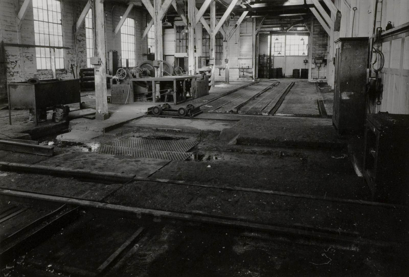Op bruin papier geplakte zwart-witfoto van een werkplaats in Utrecht. In het midden van de foto is een blootliggende pijp te zien, die bijna geheel is opgegraven. De ruimte heeft een zandvloer. Rechts op de foto is een kuil in het zand te zien. Onder de foto is met een zwarte pen de titel 'Werkplaats Utrecht' geschreven. Ook is met zwarte pen het voormalige objectnummer 3763 onder de foto geschreven.