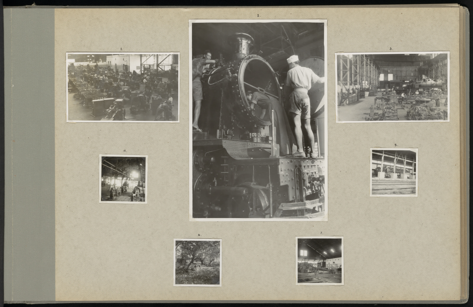 Zeven foto's uit een fotoalbum van het personeel van het Verenigd Spoorwegbedrijf voor J.W.J. Beek met foto's van de spoorwegen in Nederlands-Indië tussen 1946 en 1948