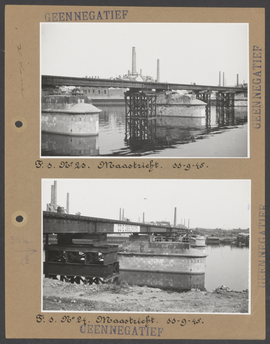 Foto in zwart-wit van een brug op twee hulppijlers die wordt hersteld. Zichtbaar zijn werklui die werken aan de brug. Vermoedelijk betreft het een deel van de brug bij Moerdijk. De foto is genomen tijdens werkzaamheden aan deze brug.