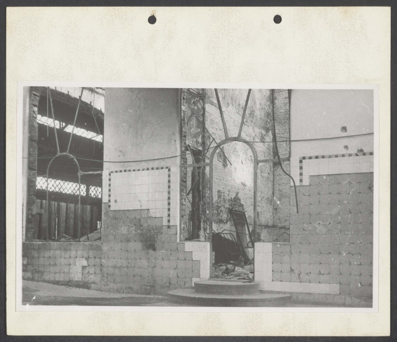 Foto in zwart wit van oorlogsschade aan het spoor tussen Westervoort en Arnhem. Naast de ophoging van de aarde ligt een weg waar bebouwing aan staat. Op de ophoging ligt het spoor, dat door oorlogshandelingen is opgebroken. Het spoor eindigt zonder waarschuwing of stootblok. In de aarde zit een groot gat. Er ligt puin rondom. De foto is op lichtgekleurd papier geplakt en heeft een stempel met daarop de tekst: 'Opname gemaakt door Martelhoff's Circuline Fotosysteem. Negatiefformaat Leica Datum: G Opject 53 No. 4 '.