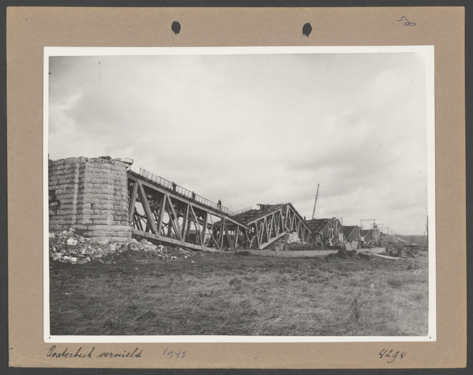 Een op bruin papier geplakte zwart wit foto van de herstelwerkzaamheden aan de vernielde brug bij Oosterbeek. De pijlers zijn kapot en brugdelen zijn weg. Op de voorgrond ligt een berg puin. Om de foto is met een blauwe stempel drie keer 'geen negatief' gestempeld.