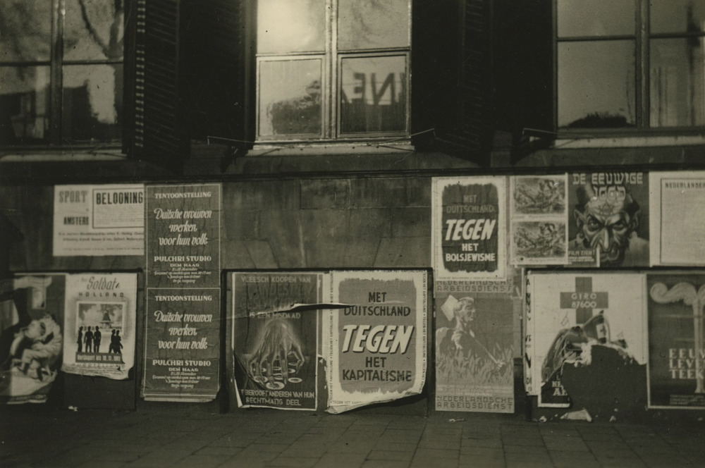 In 2011 vervaardigde digitale reproductie van een omstreeks 1943 gemaakte foto, afkomstig uit een particulier fotoalbum. Afbeelding van enkele aangeplakte affiches met Nazi propaganda op een muur te Utrecht.