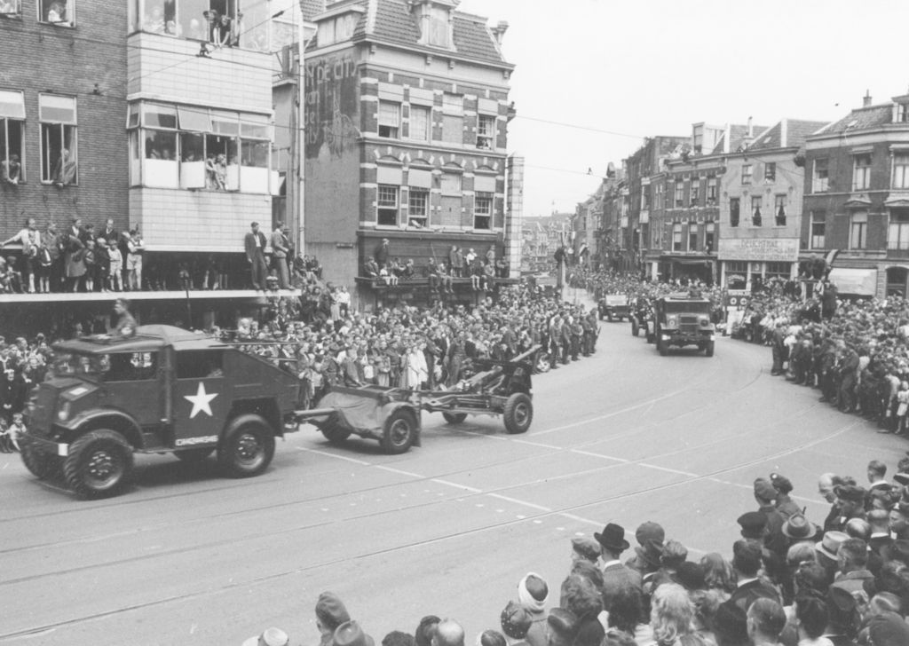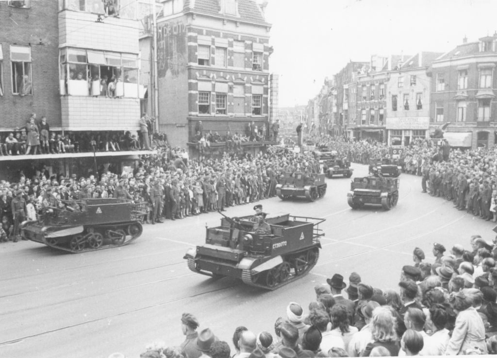 In ca. 1970 vervaardigde reproductie van een in 1945 gemaakte foto. Afbeelding van de Memorial D-Day Parade.<br/>Legervoertuigen van de 3rd Canadian Infantry Division in de Potterstraat te Utrecht; op de achtergrond de Voorstraat.