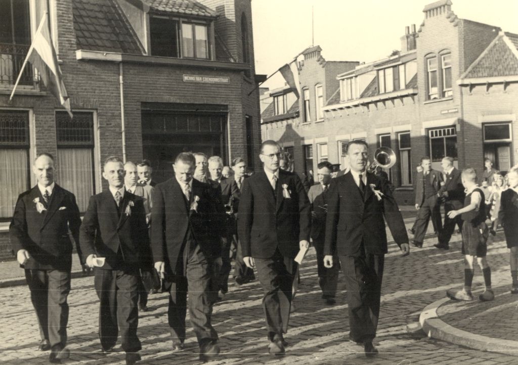 Afbeelding van de leden van het comité ter voorbereiding van de bevrijdingsfeesten in de omgeving van de Van Humboldtstraat te Utrecht met o.a. de heren C.W. Slot (eigenaar Kantoorboekhandel en Leesbibliotheek Willem van Noortstraat 86) en De Vries (bedrijfsleider Heuzen's Lingerie Huis).