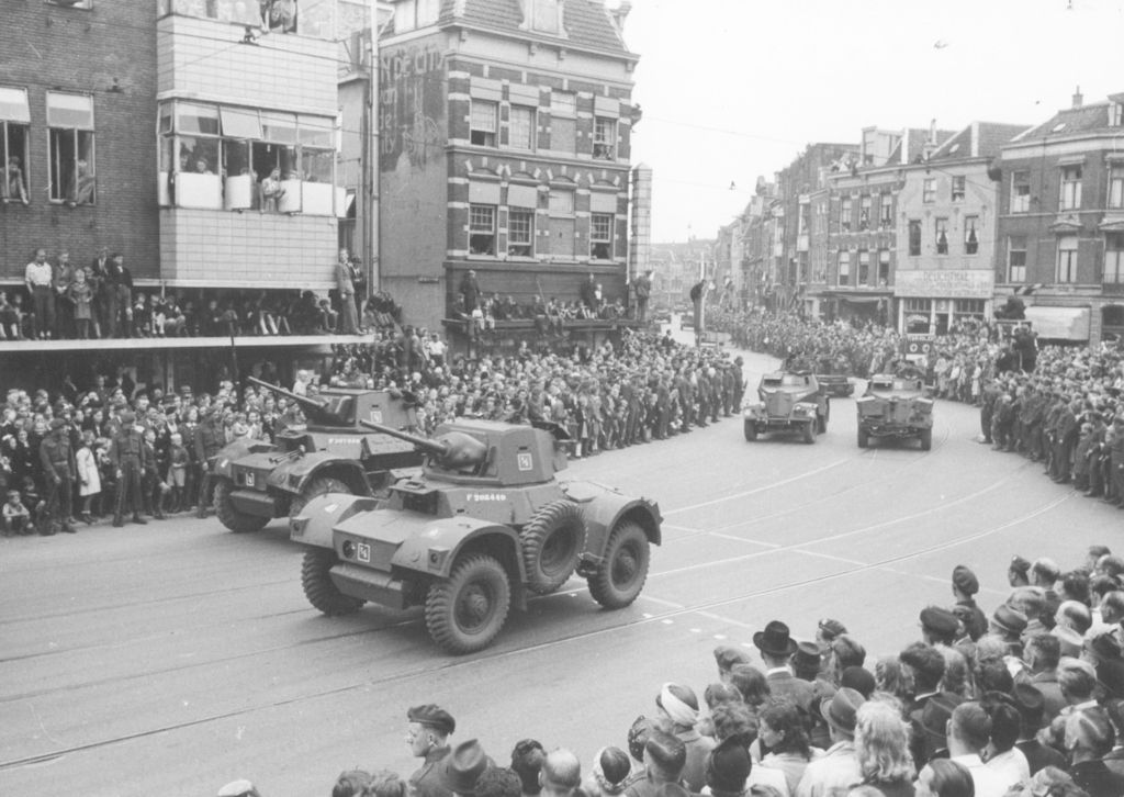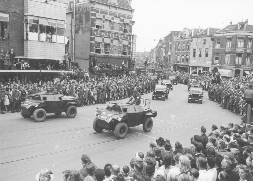 In ca. 1970 vervaardigde reproductie van een in 1945 gemaakte foto. Afbeelding van de Memorial D-Day Parade.<br/>Legervoertuigen van de 3rd Canadian Infantry Division in de Potterstraat te Utrecht; op de achtergrond de Voorstraat.