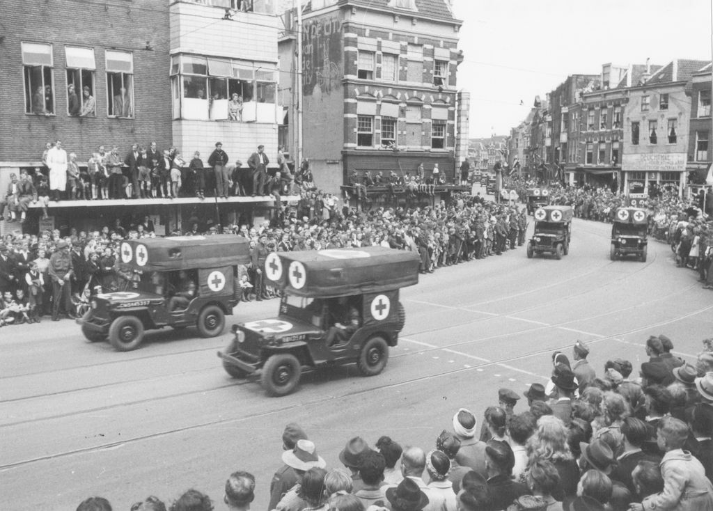 Afbeelding van de Memorial D-Day Parade.<br/>Rode Kruis ambulances van de 3rd Canadian Infantry Division in de Biltstraat, ter hoogte van het huis nr. 62, te Utrecht. Litt.: Bibl.HUA VIII D 11, dr. A. van Hulzen, Utrecht in 1945.<br/>L 72 IV K, Dagblad Trouw, 7 juni 1945.<br/><br/>In ca. 1980 vervaardigde fotoreproductie van een op 6 juni 1945 gemaakte foto.<br/>Fotonr. Gemeentearchief Arnhem B 2699/11.