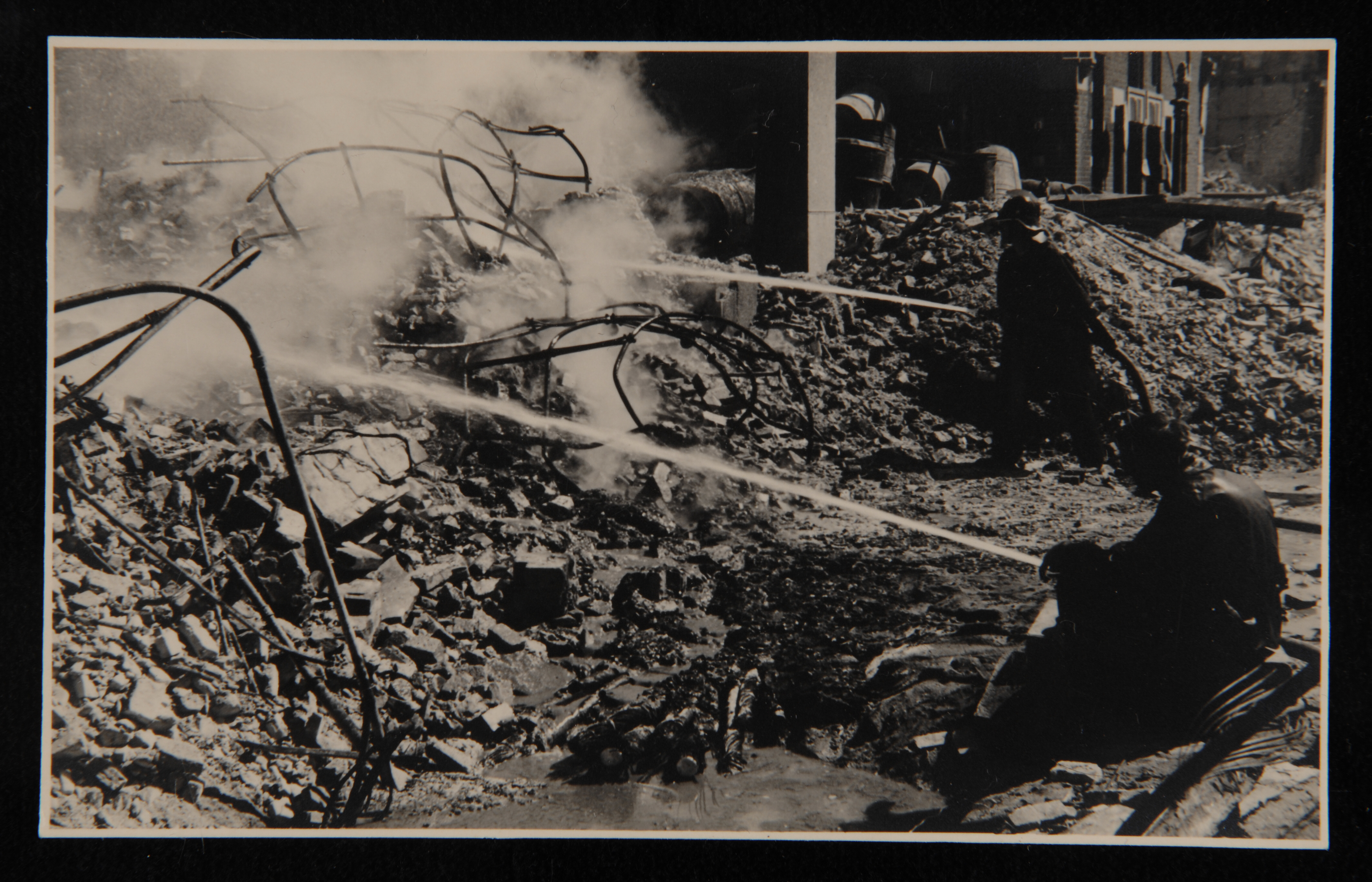 Foto van een straat vol puin en met vernielde gebouwen en twee mensen op straat, met de tekst "Scheveningschestraat"