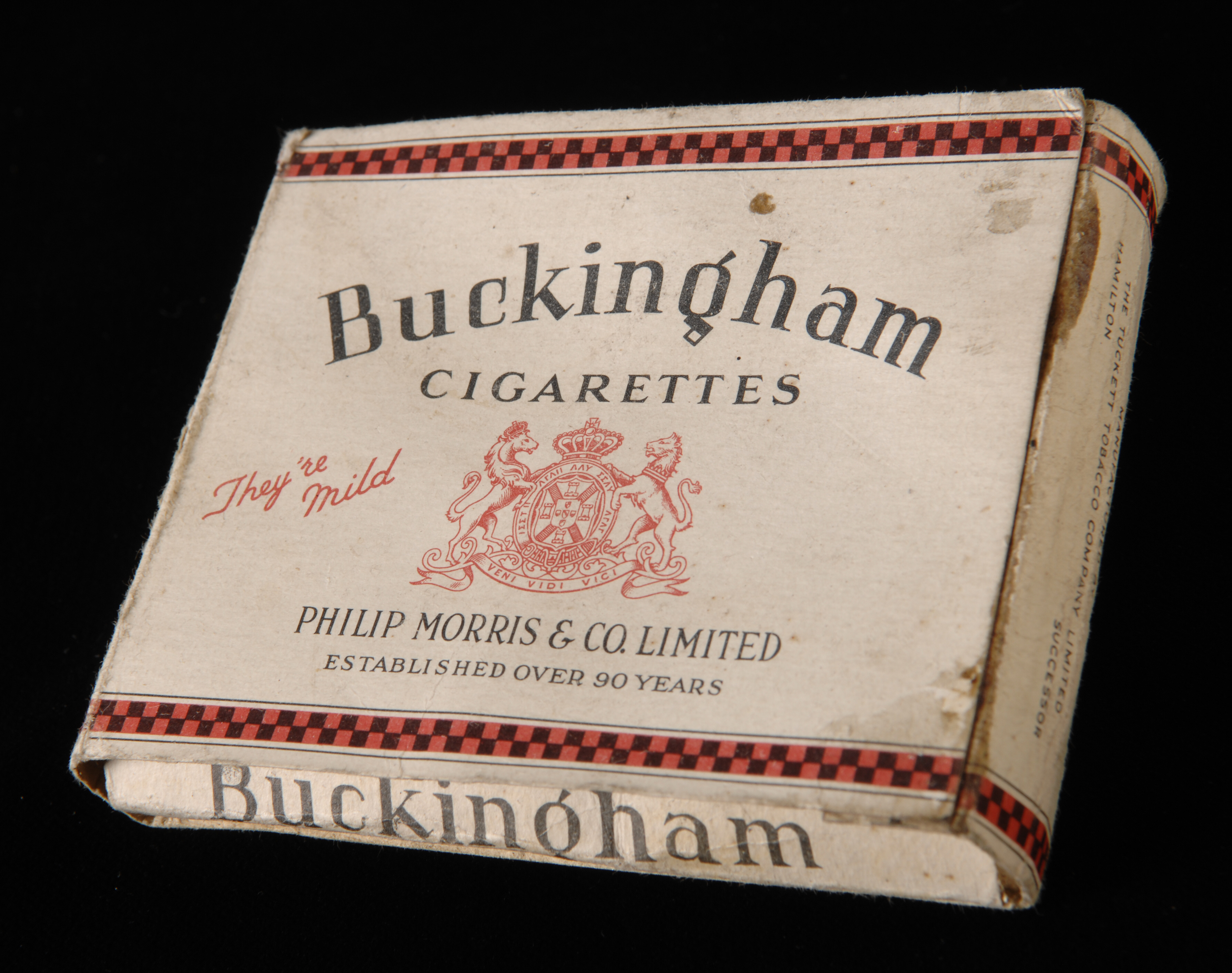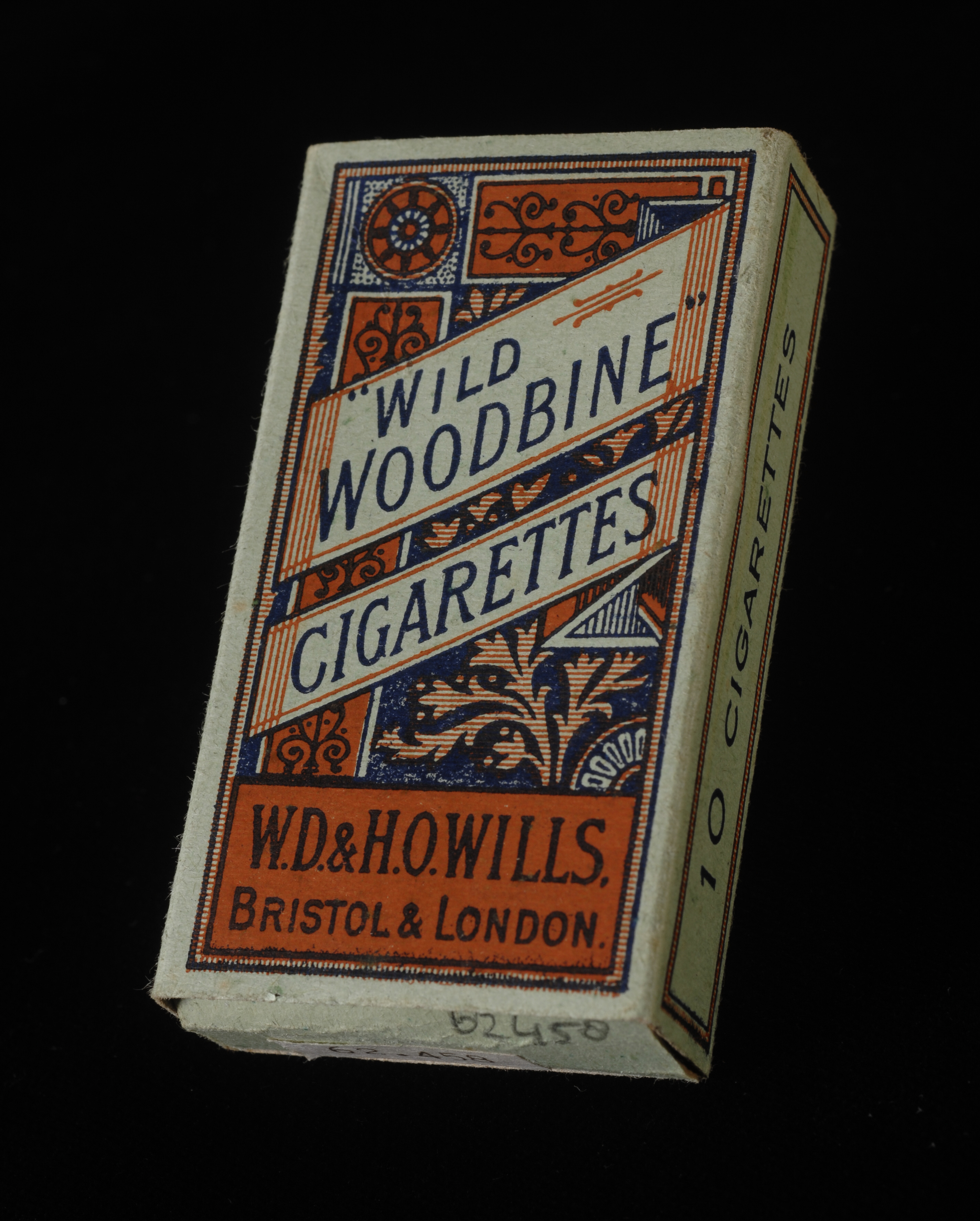 Rechthoekige, witte verpakking voor sigaretten, aan bovenzijde geopend, waarin geopende zilverpapieren binnenverpakking. Bedrukt in zwart, geel, rood en goud, aan voorzijde een heraldisch wapen bekroond met een bisschopsmijter en omlijst met acanthusbladeren; dit wapen aan zijkanten herhaald; langs boven- en benedenrand rondom een lijst met gele en rode ruiten.