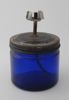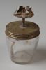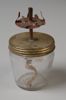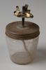 Lamp vervaardigd uit knotsvormige fles, kurk, patroonhuls en lont. In patroonhuls zijn vier inkepingen gevijld met kleine gaatjes.