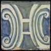 Tegel onderdeel van een schoorsteenpilaster, oorspronkelijk twaalf of dertien hoog. Rossige scherf, vierkant, drie spijkergaten. Blauw op wit fond. Tegel vormt onderdeel van een éénrijïge pilaster in Renaissance stijl en toont kapiteel van een zuil met hierboven gestileerde aanduiding rudimentaire poten van kariatide.