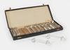 Rechthoekige kleine doos (1) van karton met los deksel (2) waarin 45 donker metalen gespen (3), "Messag"