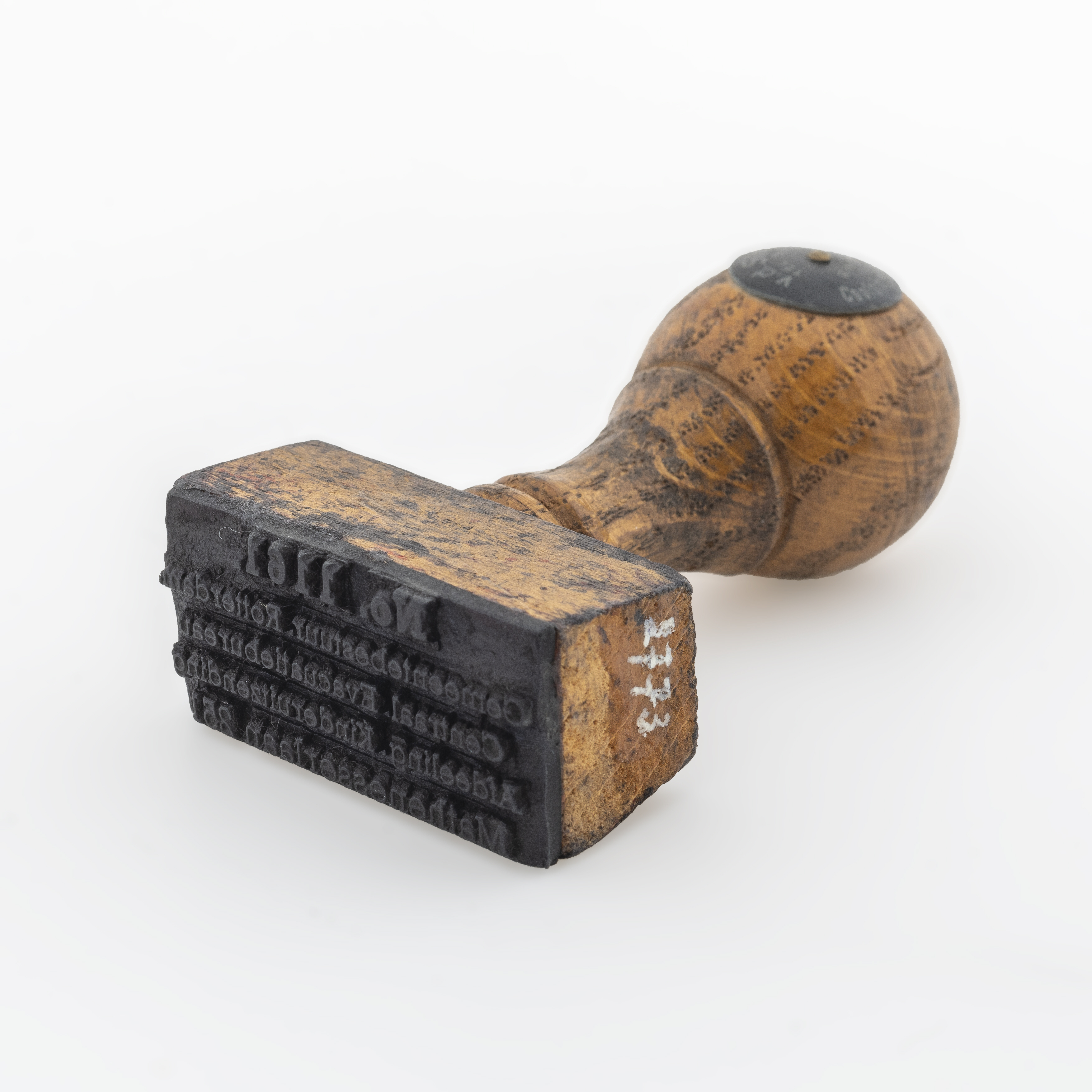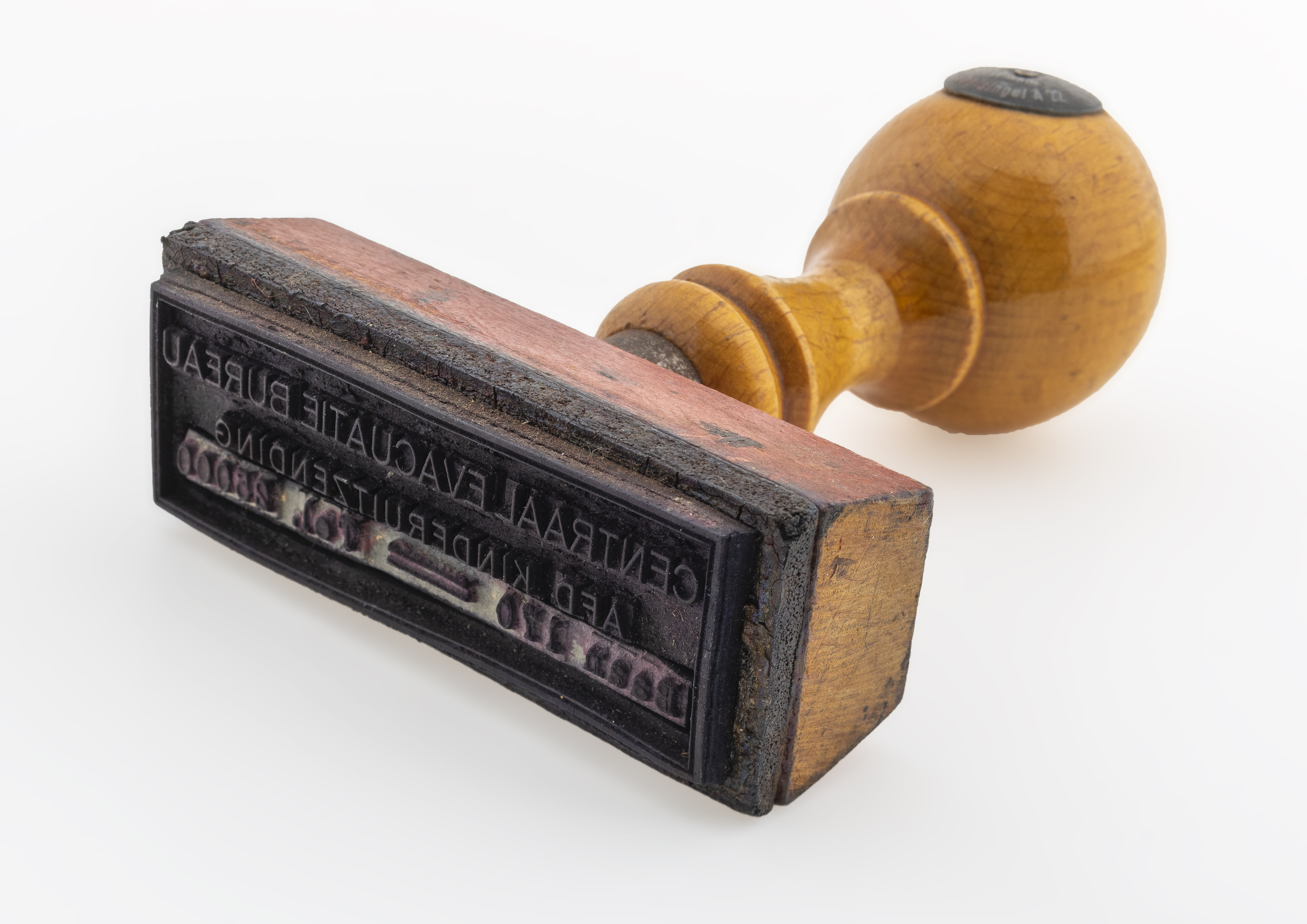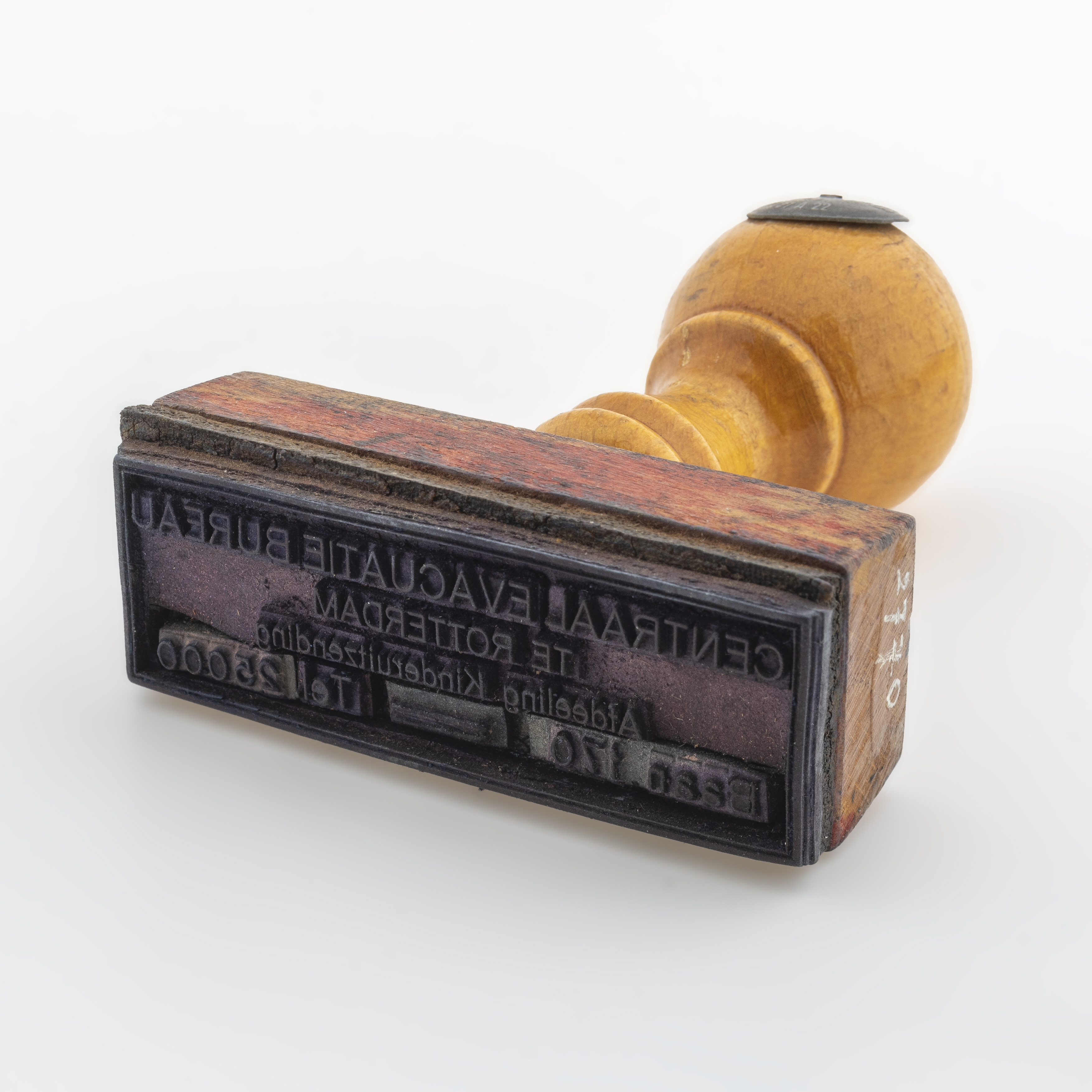 Stempel met houten steel en met tekst voor bureau voor evacuatie van kinderen.