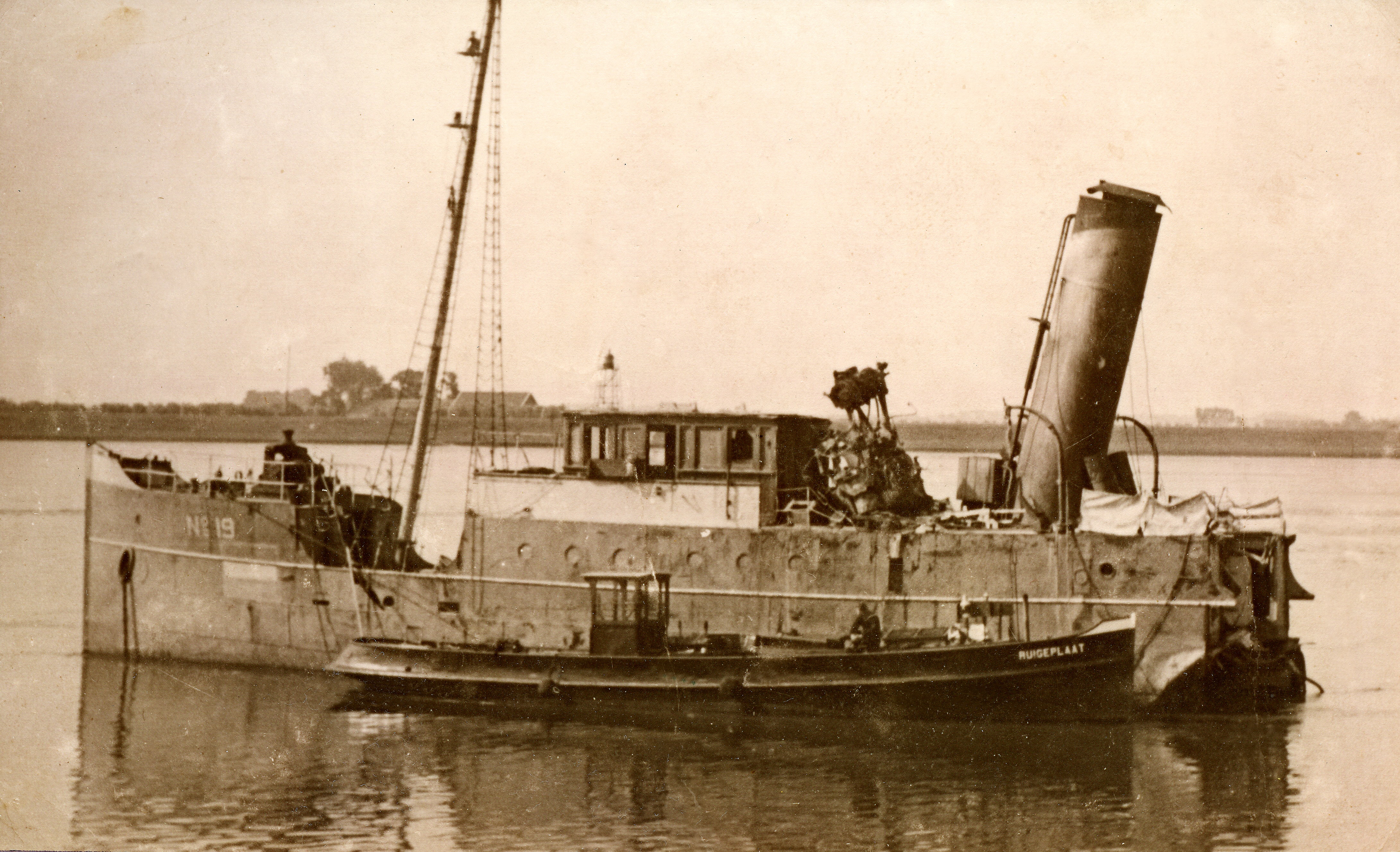 Achterschip van Stoomloodsboot no. 19. Tijdens de mobilisatie van september 1939 tot 10 mei 1940 was de loodsboot in dienst van de Koninklijke Marine als Bewakingsvaartuig BV 19a. Op 11 mei 1940 liep de BV 19a tussen Vlaardingen en Maassluis op een magnetische mijn waarbij 16 bemanningsleden om het leven kwamen. De mijnen waren door de Duitsers in het Scheur afgeworpen om scheepvaartverkeer onmogelijk te maken. De BV 19a was met de goudvoorraad van de Nederlandse Bank in Rotterdam onderweg naar Engeland. Op 1 juni 1940 werd in opdracht van de Nederlandse Bank door W.A. van den Tak's Bergingsbedrijf begonnen met de berging van de goudstaven en het lichten van het wrak dat in twee stukken op de Noordoever werd gezet.