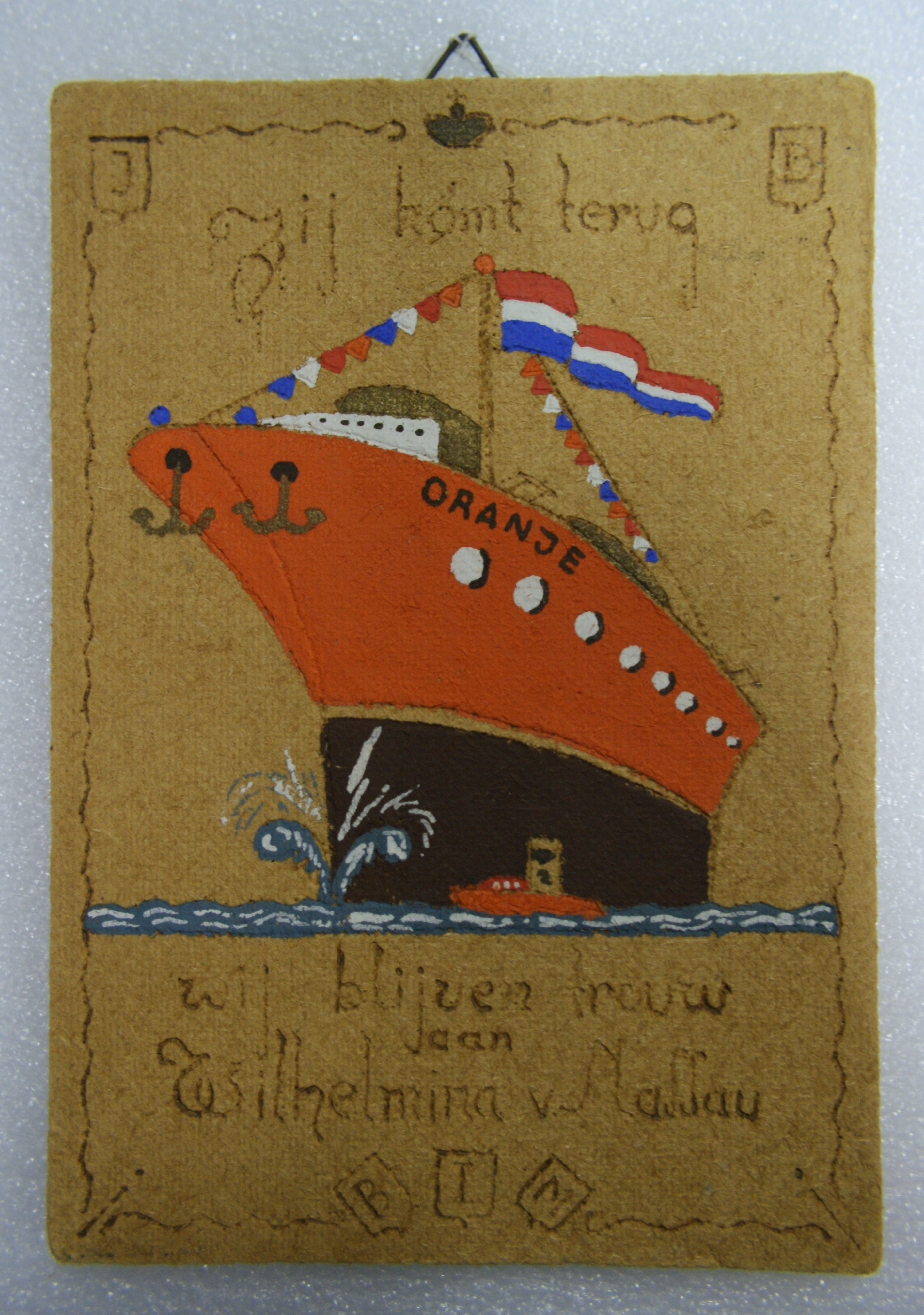 Rechthoekig staand stuk zachtboard. Midden erop staat een rood/bruin stoomschip met 2 ankers en witte patrijspoorten. Op de boeg staat in zwart de tekst: ORANJE. Van het dek tot de mast hangen rood/wit/blauw/oranje vlaggetjes en een grote rood/wit/blauwe vlag. Op het dek staat een witte kajuit en 2 bruine schoorstenen. Het schip vaart in een blauw/witte zee met naast zich een kleine rode sloep. De omlijning van de decoratie bestaat uit een ingekraste dunne lijn. De tekst en verdere decoratie zijn ingekrast en ingevuld met bruine verf. Boven het schip staat de tekst: Zij komt terug. Onder het schip staat: wij blijven trouw/aan/Wilhelmina v. Nassau. 1 cm naar binnen vanaf de buitenrand van het zachtboard staat rondom een gegolfde lijn. Deze is in de bovenhoek en onderbroken door links een schild met de letter J en rechts een schild met de letter B. Boven in het midden is de gegolfde lijn onderbroken door een kroon die met donkergoud is ingekleurd. Onderaan is de lijn in het midden onderbroken door 3 schilden met daarin de letters B, I en M. Op de achterkant van het zachtboard zit een rechthoekig metalen plaatje met 2 spijkers in het board met erboven aan vast een 3-hoekige haak die boven het board uitsteekt.