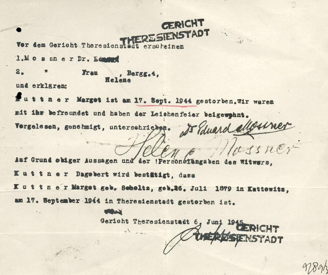 Op grond van een verklaring van getuigen en weduwnaar Dagobert Kuttner wordt door het Gericht Theresienstadt te kennen gegeven dat Margot Kuttner-Scholtz overleden is op 17 september 1944.
