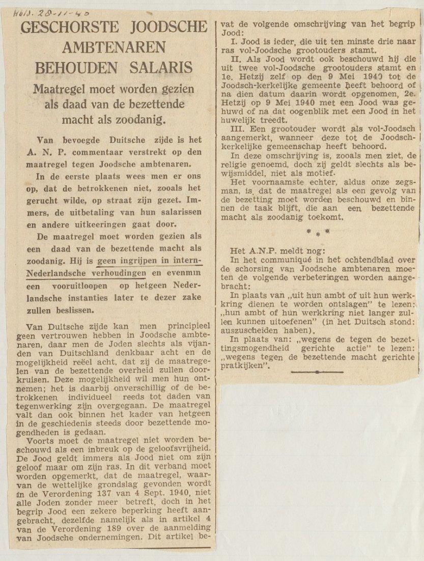 Volgens dit bericht (uit het Algemeen Handelsblad?), d.d. 28 november 1940, zouden ontslagen joodse ambtenaren wel hun salaris behouden.