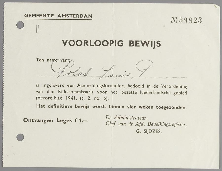Tentoonstellingstekst Nationaal Holocaustmuseum, maart 2024 Voorlopig bewijs Op 10 januari 1941 maakte de bezetter bekend dat iedereen met ten minste één Joodse grootouder zich moest laten registreren. Na registratie bij het plaatselijke bevolkingsregister ontving je dit 'voorloopig bewijs'.